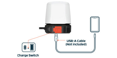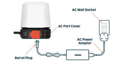 1. Connect the relevant Power Adapter cable to the Power Transformer (included). Open the AC port cover and plug the barrel plug into the AC Charging Port on the light. Charging will begin automatically.