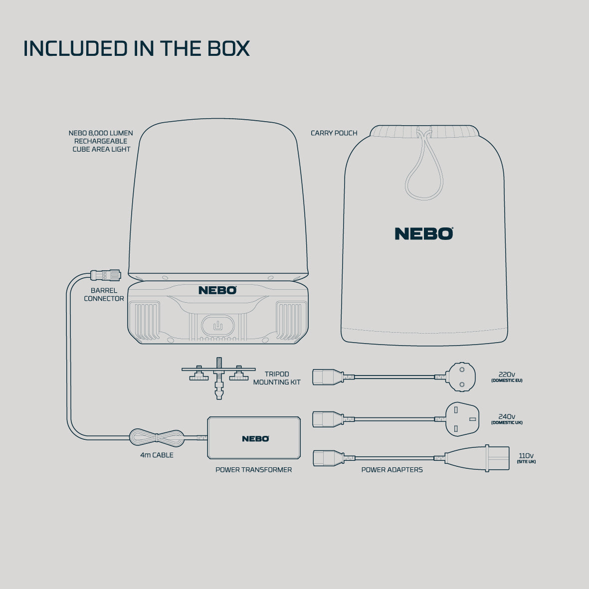 Included is a carry bag and tripod mounting kit, it's ready to tackle any task with unparalleled convenience and efficiency. Illuminate your workspace with confidence – choose the NEBO 8K Cube Area Light and experience lighting excellence like never before.