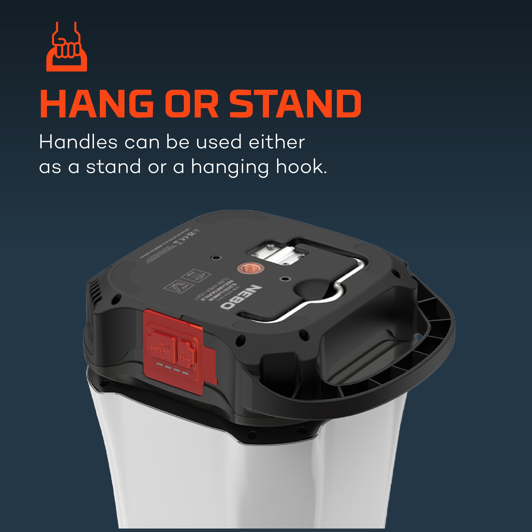Designed for convenience, the NEBO 8K Cube Area Light comes equipped with a folding hanging hook and a sturdy carry handle, enabling effortless portability from one task to the next. Additionally, its built-in USB-A out power bank feature provides added utility, serving as a reliable power source for your essential devices.