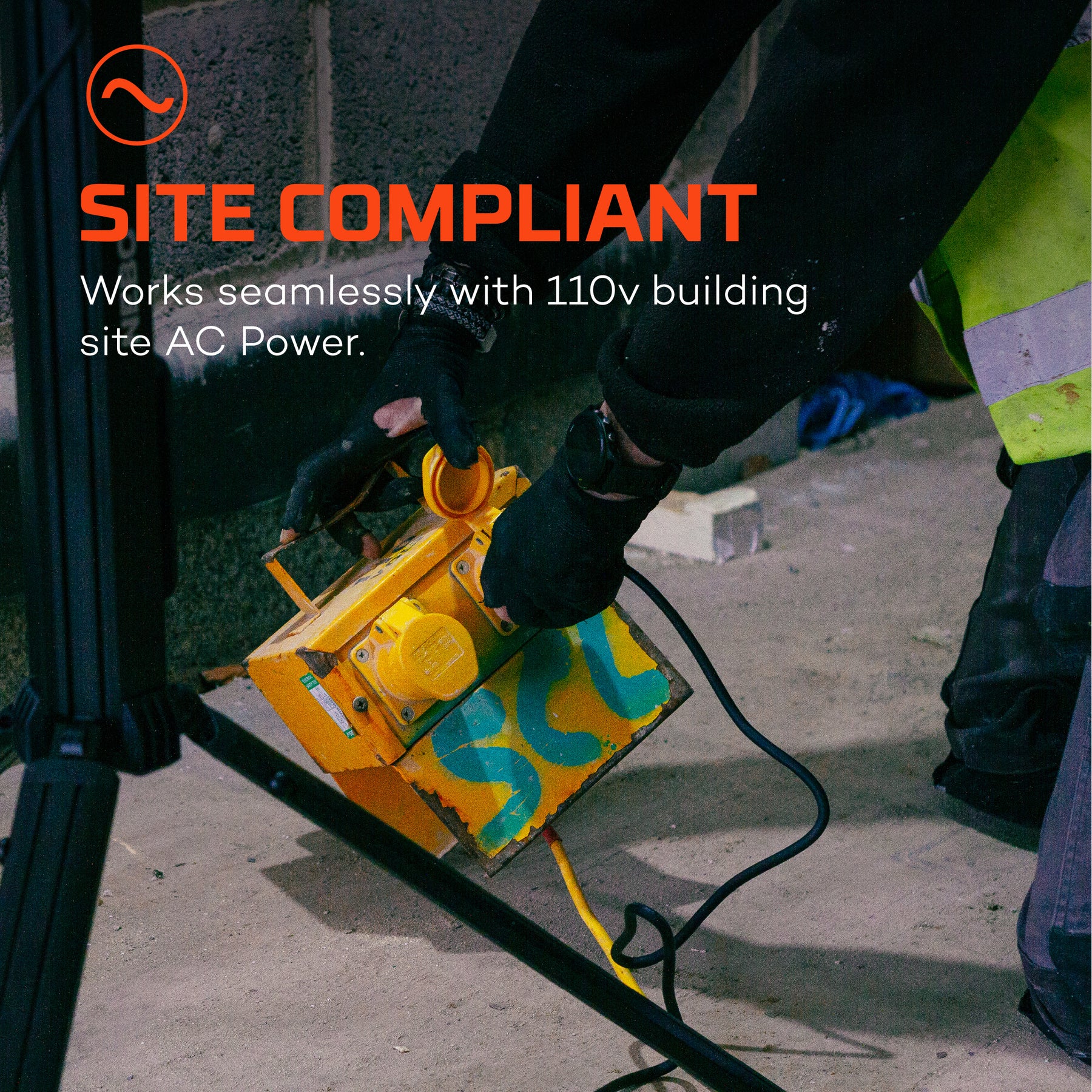 With four battery-powered modes ranging from 100% brightness for 1.5 hours to 25% brightness for 5 hours, the NEBO 8K Cube Area Light offers versatility to suit your specific needs. When plugged into AC power, it maintains a consistent 5,600 lumens output, ensuring uninterrupted illumination while charging the battery. Compliant with UK site standards, the NEBO 8K Cube Area Light includes a 110v AC power plug for building site use, along with all necessary cables for UK 240v and EU 220v power sources.