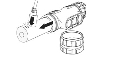 Unscrew the magnetic base to reveal the rechargeable battery. Connect the USB cable to power, then plug it into the battery as shown. The charging indicator glows red when charging; green when fully charged.